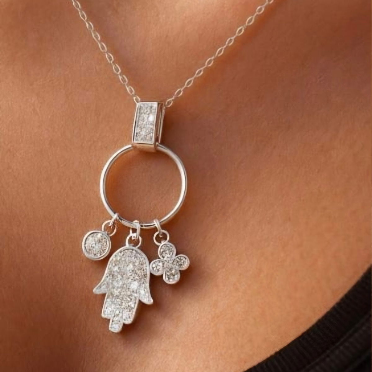 El Collar Mano de Hamsa (o Mano de Fátima) en plata con circones es una de las piezas más populares en joyería tanto por su belleza estética como por su profundo significado espiritual.