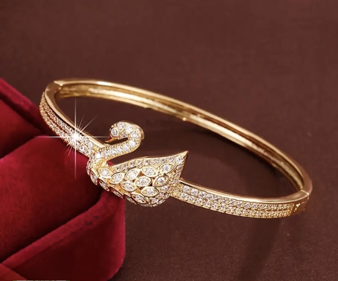 Elegancia en una sola pieza. Esta pulsera esclava luce un cisne con zircones que reflejan la luz con un brillo sutil y femenino. Un dorado delicado que realza cualquier look sin recargar. ✨🦢