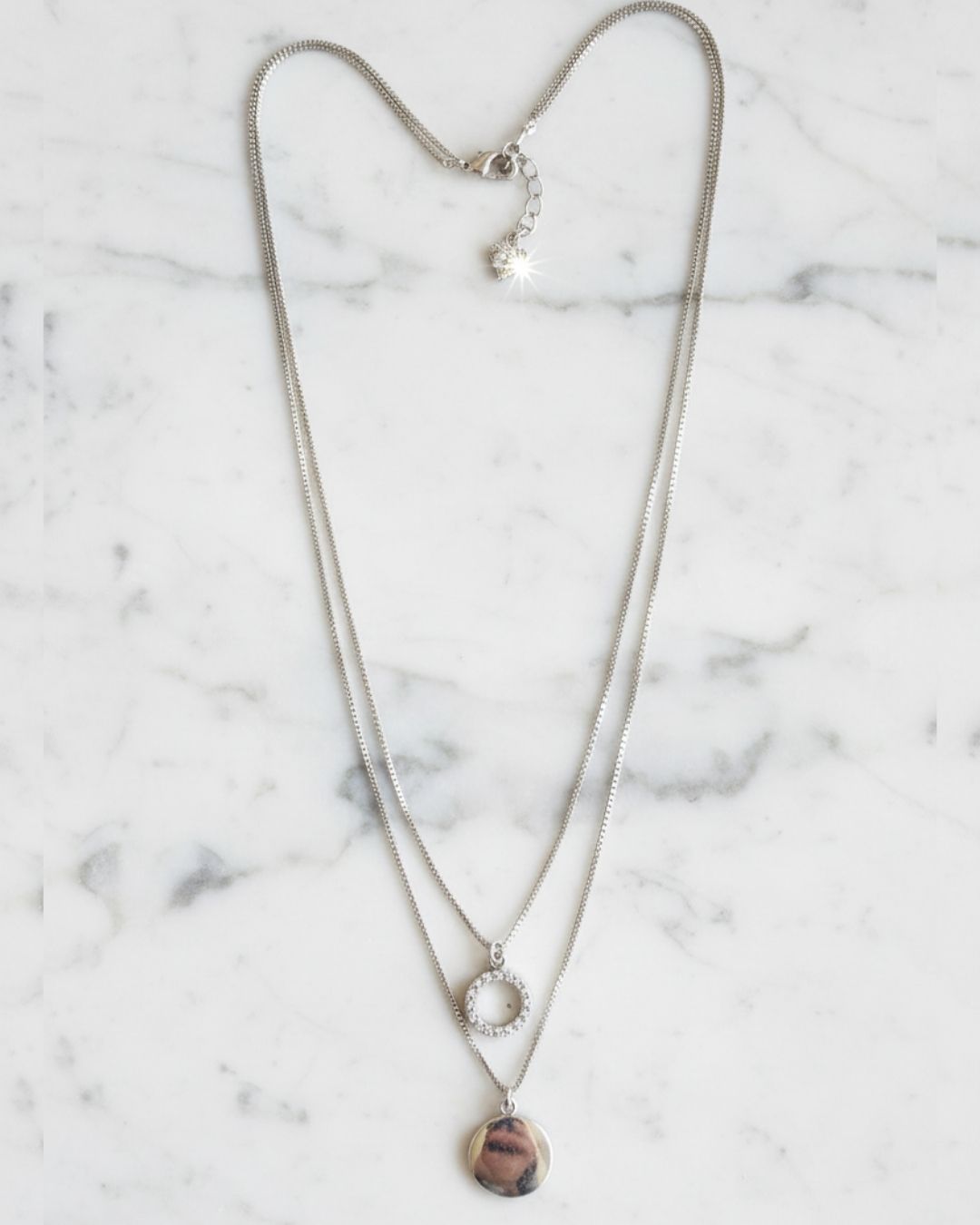La segunda, con un dije liso en plata pulida, que refleja la luz con sutileza y equilibra el conjunto con un toque moderno.