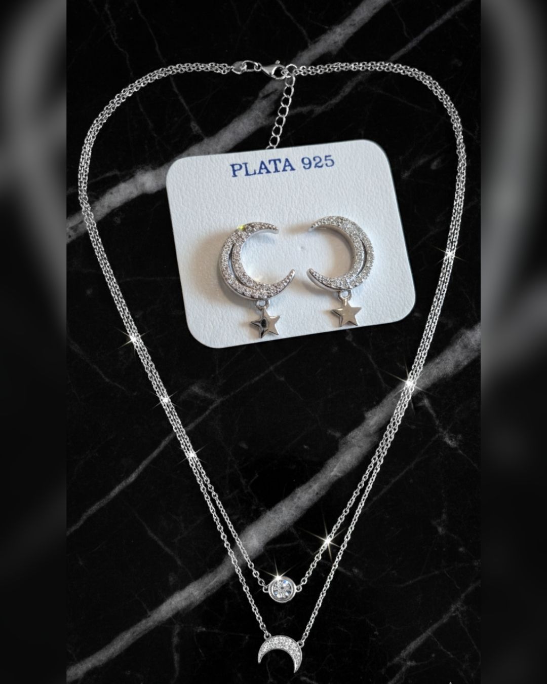 Fabricado en Plata 925 auténtica, este set combina circones engarzados que reflejan la luz con cada movimiento, evocando la magia del cielo nocturno.