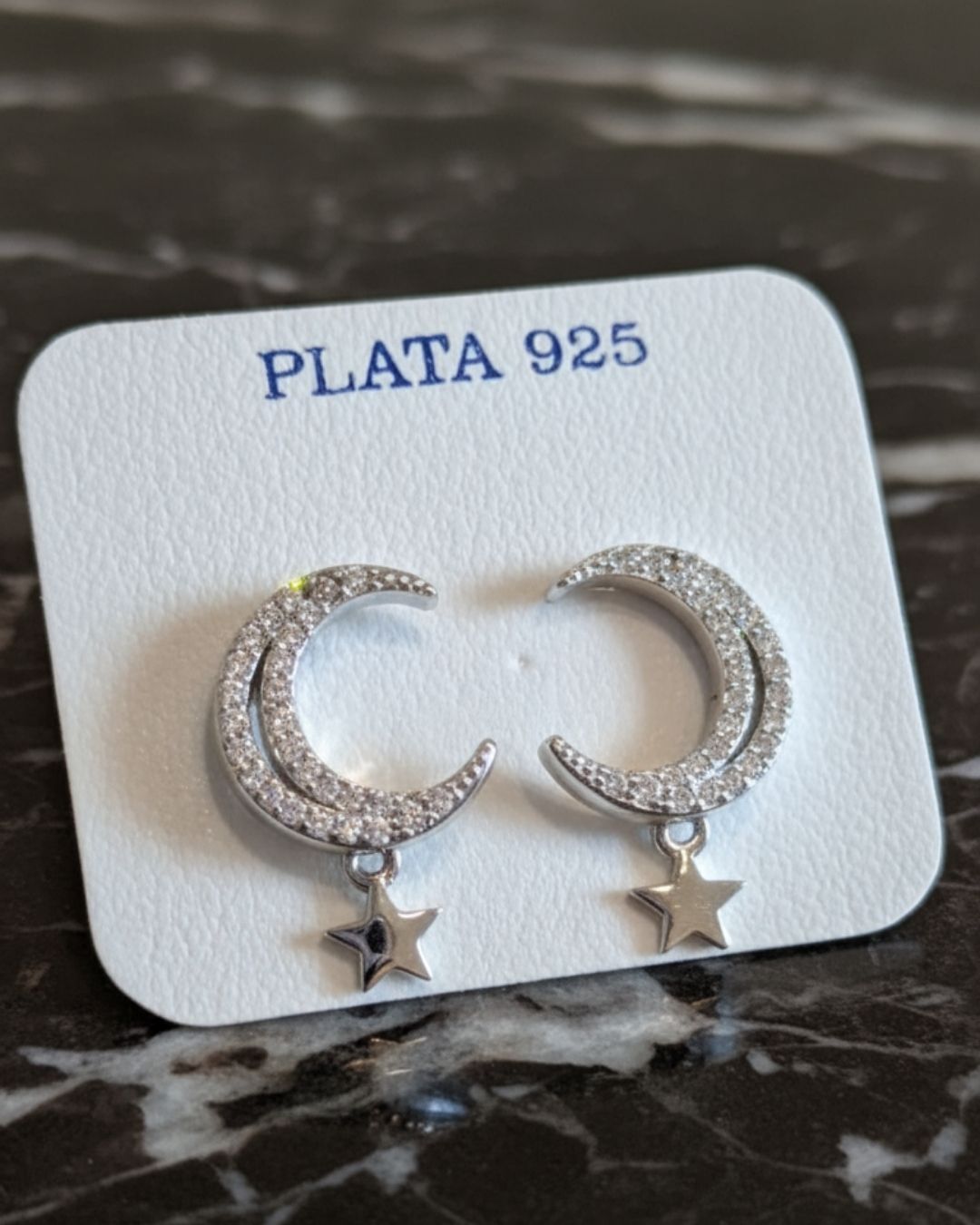 Los aros a juego repiten el motivo lunar, realzados con una estrella colgante en plata pulida, creando un equilibrio perfecto entre sutileza y encanto celestial.