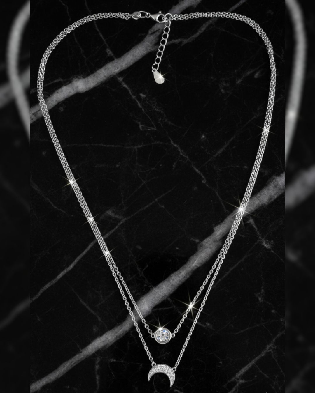 El collar doble presenta una primera cadena con un circon central facetado, seguido por una segunda cadena con un dije de luna creciente pavé, símbolo de energía y renovación.