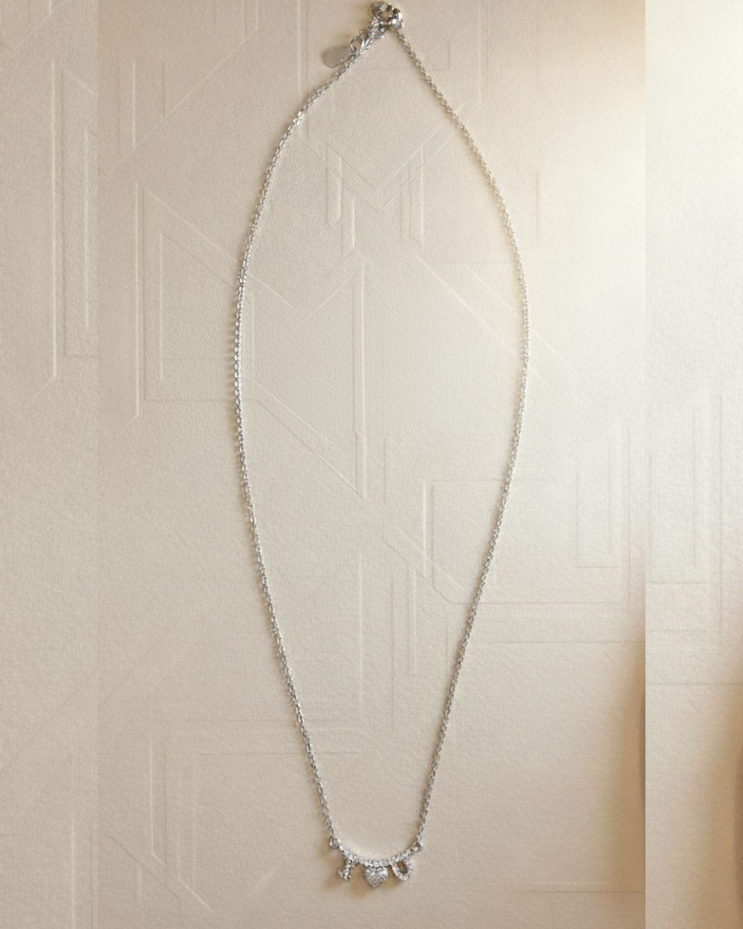 El collar presenta una fina cadena con colgantes en forma de corazones y estrellas, símbolo de cariño y conexión.