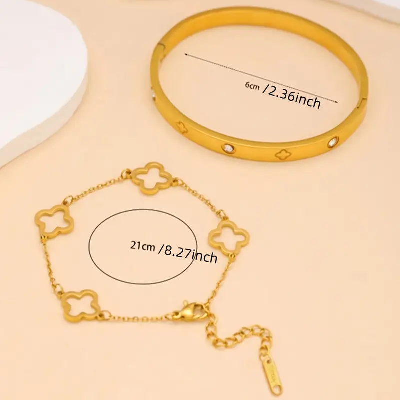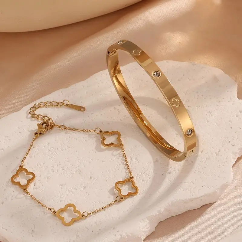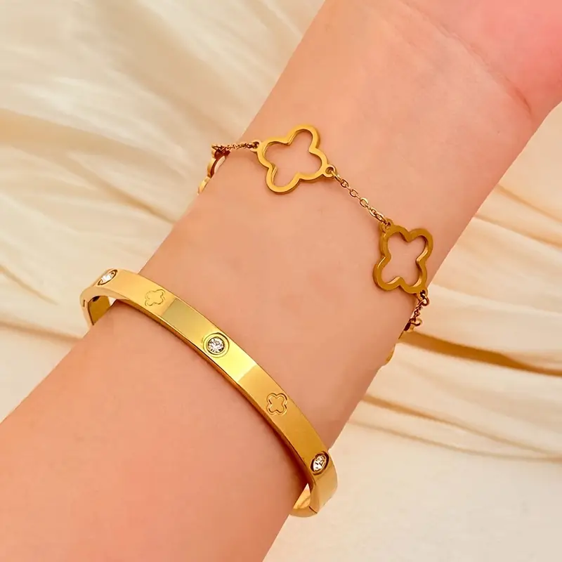 Doble impacto, cero esfuerzo: 1 pulsera con zircones incrustados + 1 pulsera con dije trébol.