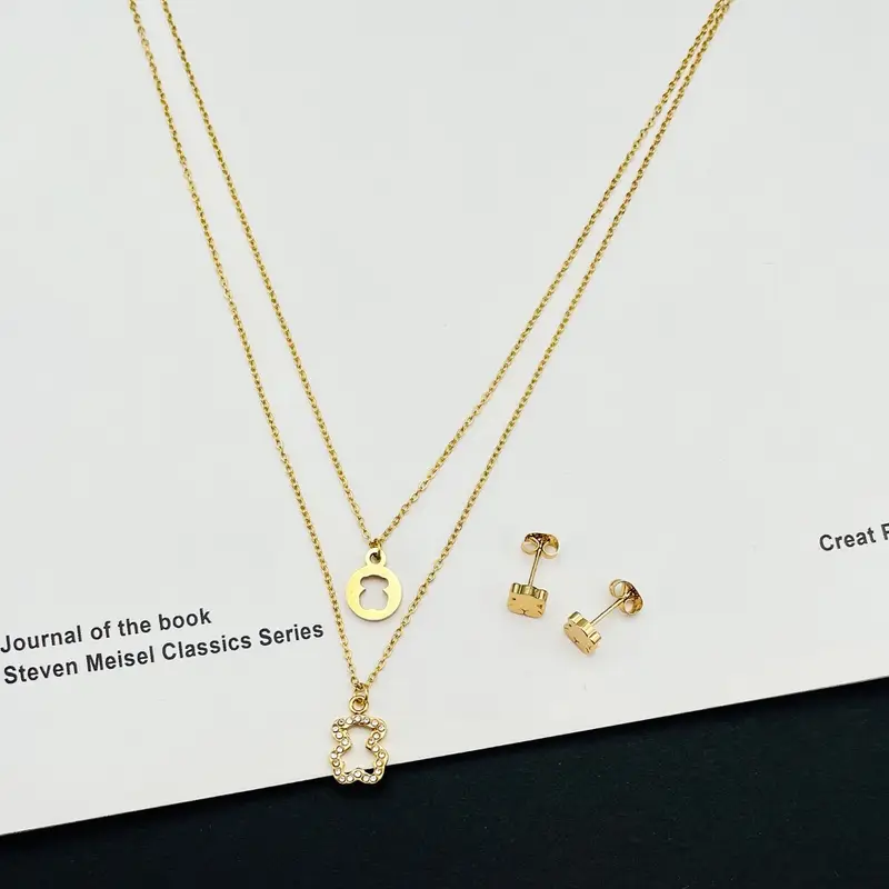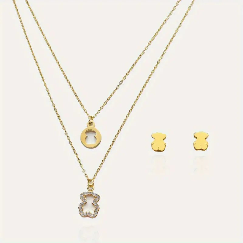 Brillo sutil, diseño tierno y un dorado que realza cualquier look. Este set minimalista de collar con cadena doble y aros presenta un oso hueco con zircones incrustados que captan la luz sin recargar. ✨🐻