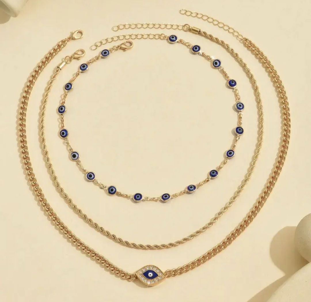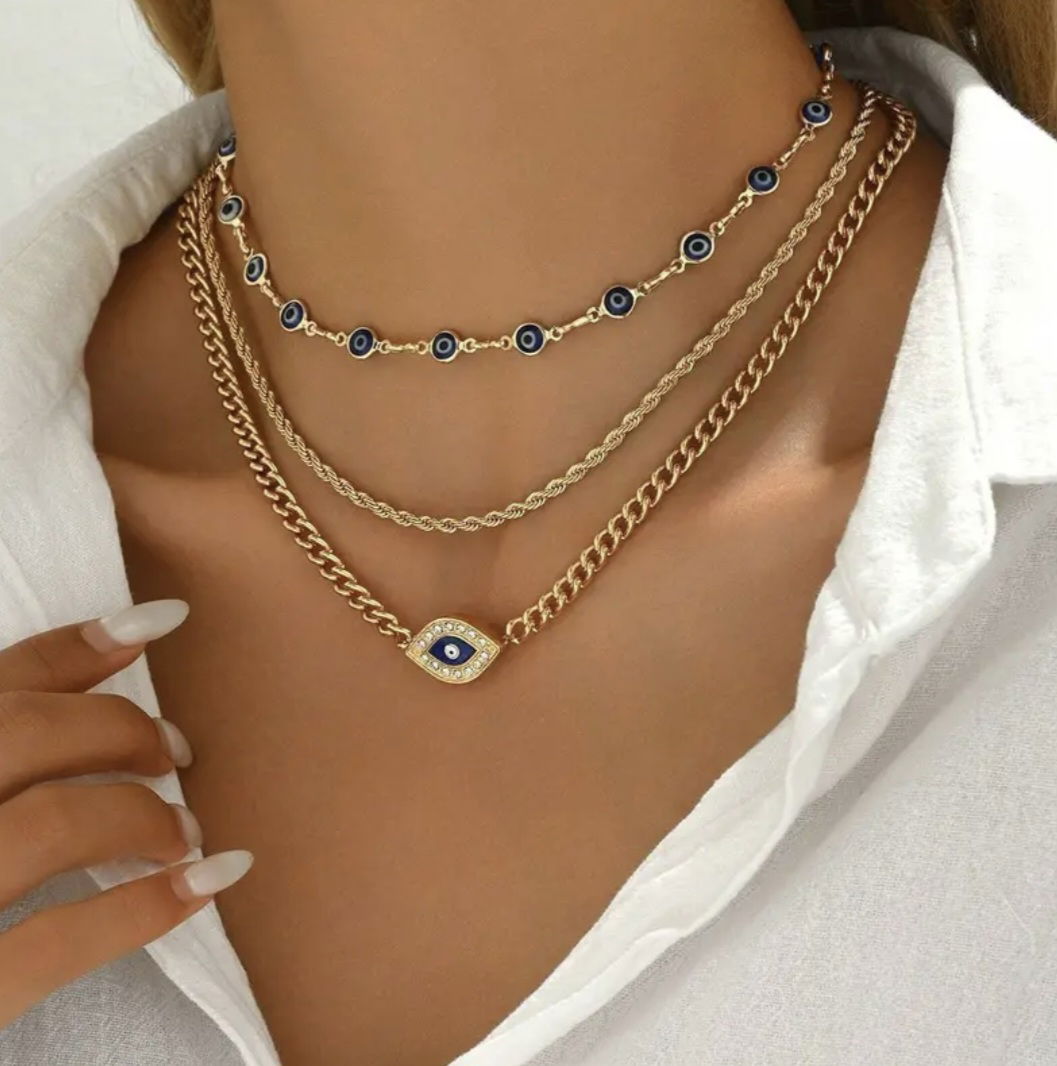 Este collar triple con baño en oro dorado 18K combina tres piezas individuales que pueden usarse juntas o por separado, creando un efecto elegante y versátil.