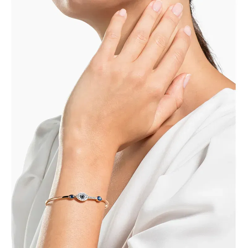 Este brazalete Swarovski fusiona el brillo del cristal pavé con la profundidad de los cristales azules, realzados por el contraste elegante del baño de oro rosa. Su doble motivo —un ojo protector y una gota azul intensa— refleja equilibrio, intuición y energía positiva.