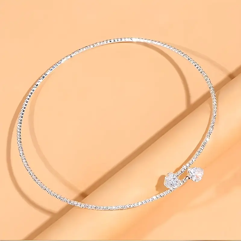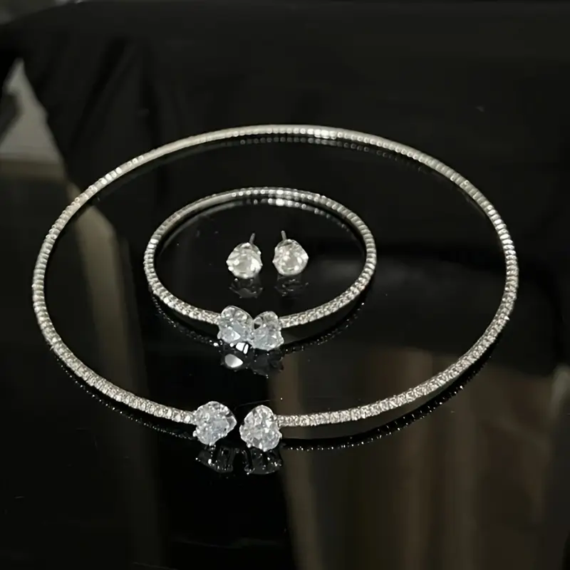 Cada pieza incorpora un delicado detalle de corazón en zircon, ubicado en las terminales del choker y la pulsera, creando una estética sofisticada y femenina.