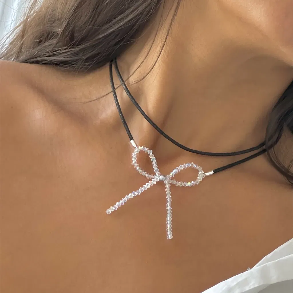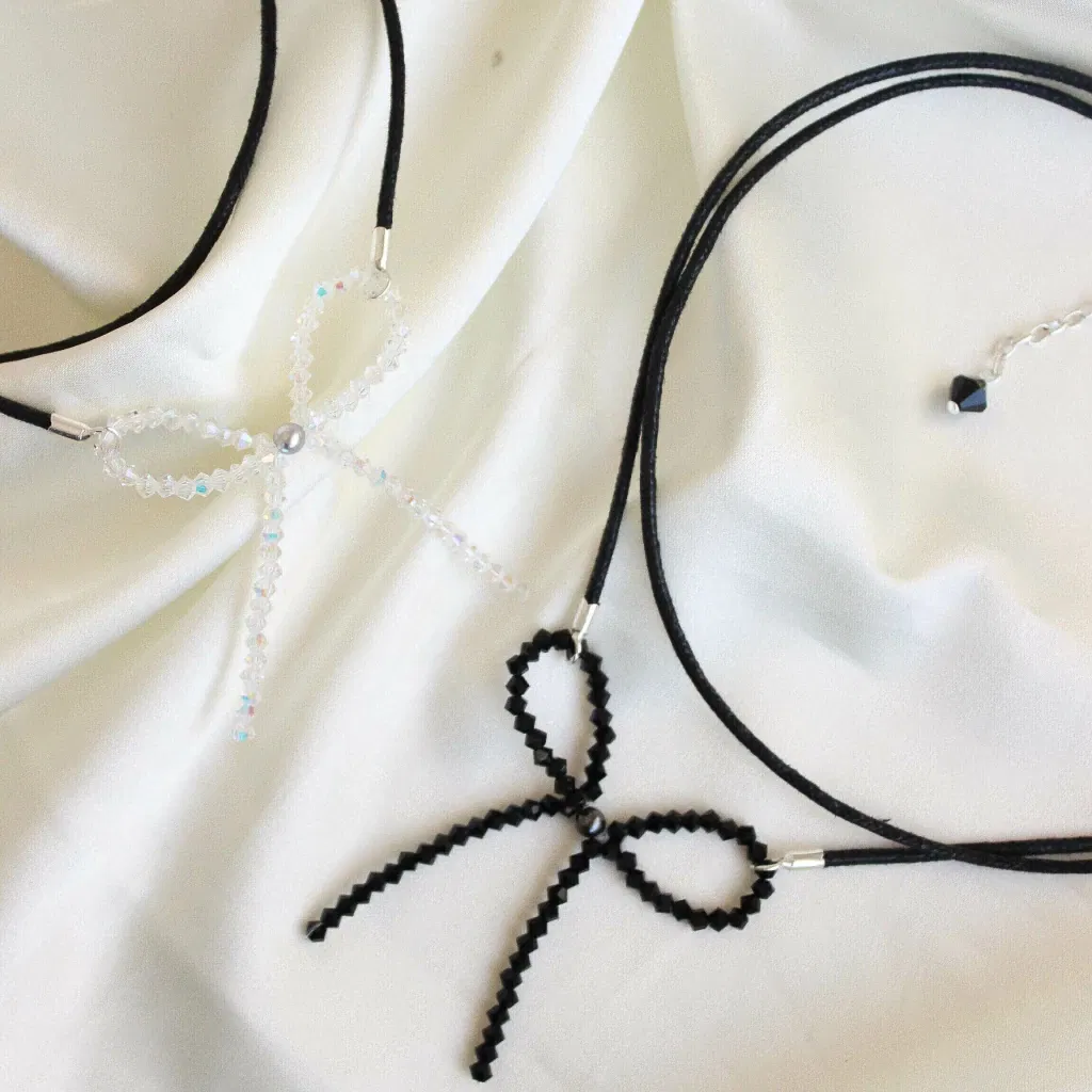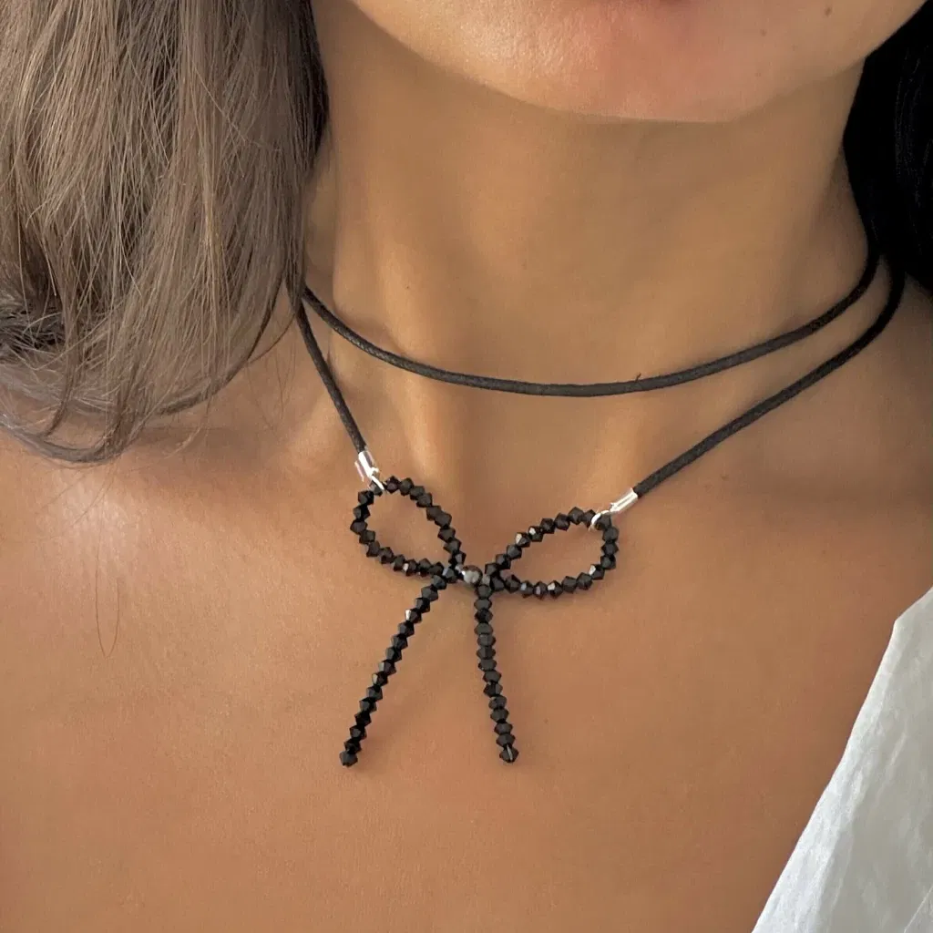 El Choker Ribbon es puro impacto, pero con elegancia. Un choker doble con moño tejido en cristales Swarovski europeos de 3 mm, pensado para que el brillo se vea fino y parejo, sin exceso. Las terminaciones en Plata 925 cierran el look con ese detalle premium que se nota.
